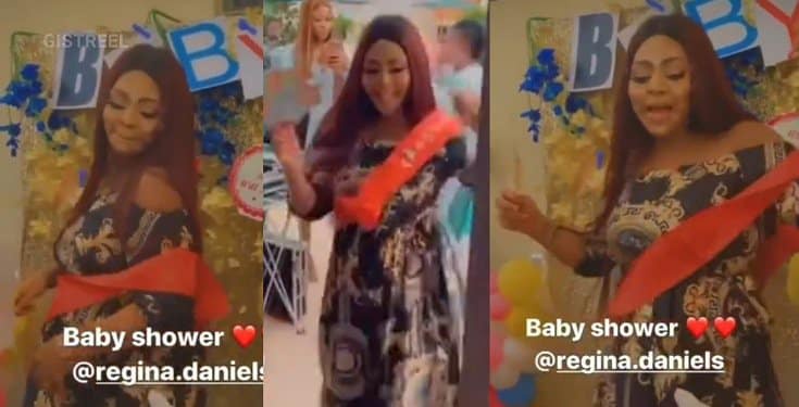 During the baby shower, a family member called Regina Daniels “Mama Ejima” while she was dancing, a hint that she may be expecting twin babies.